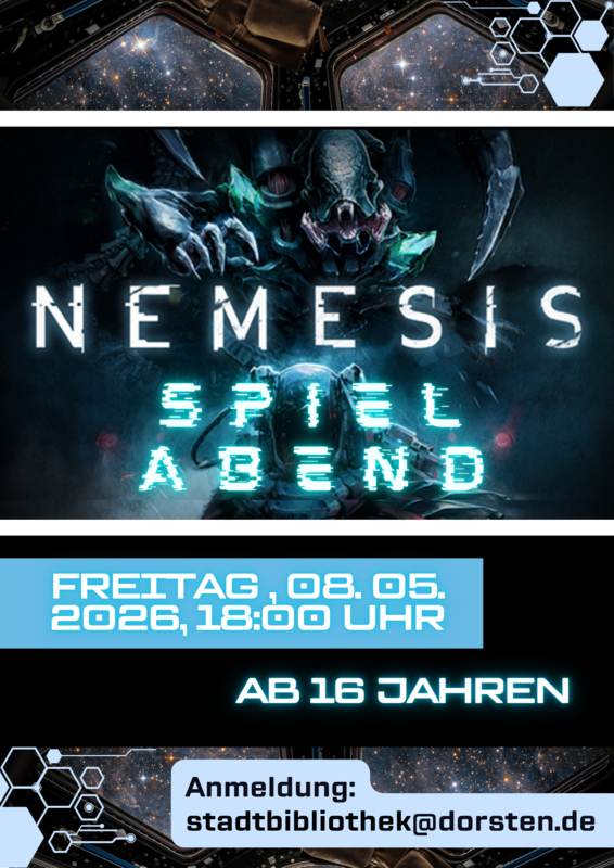 Wir bieten an diesem besonderen Abend geführte Spielrunden. Für Anfänger nutzen wir das "Nemesis" Grundspiel, für Fortgeschrittene bieten wir von "Nachspiel", über "Hirngespinste" und "Lockdown" zahlreiche Erweiterungen und Variationen an (näheres wird bei der Anmeldung besprochen).