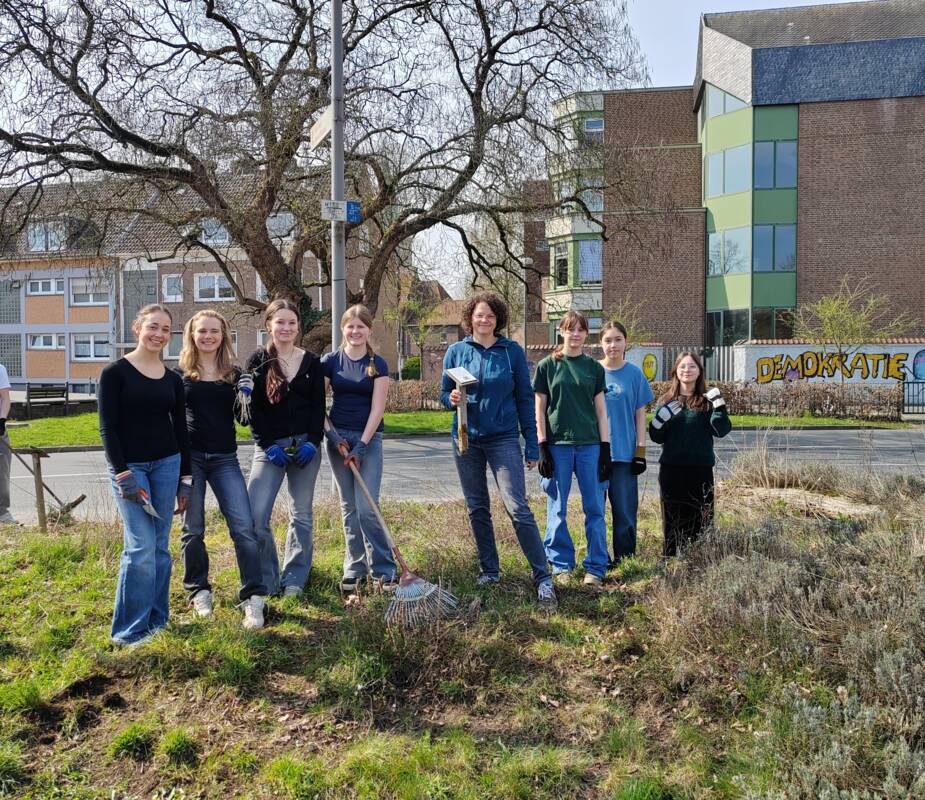 Stadt DorstenDie Klasse 9B des St. Ursula Gymnasiums Dorsten hat gemeinsam mit ihrer Biologielehrerin Joana Schindel und mit Umweltplaner Max Caesar vom Planungs- und Umweltamt der Stadt Dorsten in dieser Woche den „Insektennaschgarten“ am Ostwall gepflegt.