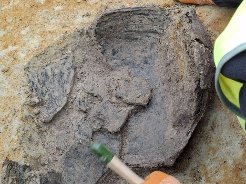 Ein weiterer eindrucksvoller Fund ist eine etwa 1,5 Meter tiefe trichterförmige Grube, in deren Boden eine große Tonschale eingelassen war – vermutlich ein früher „Erdkühlschrank“, in dem verderbliche Lebensmittel kühl gelagert wurden. Das Gefäß konnte vollständig geborgen werden. Das Verfüllmaterial wird derzeit im Labor untersucht, um nähere Erkenntnisse über seine Nutzung zu gewinnen.