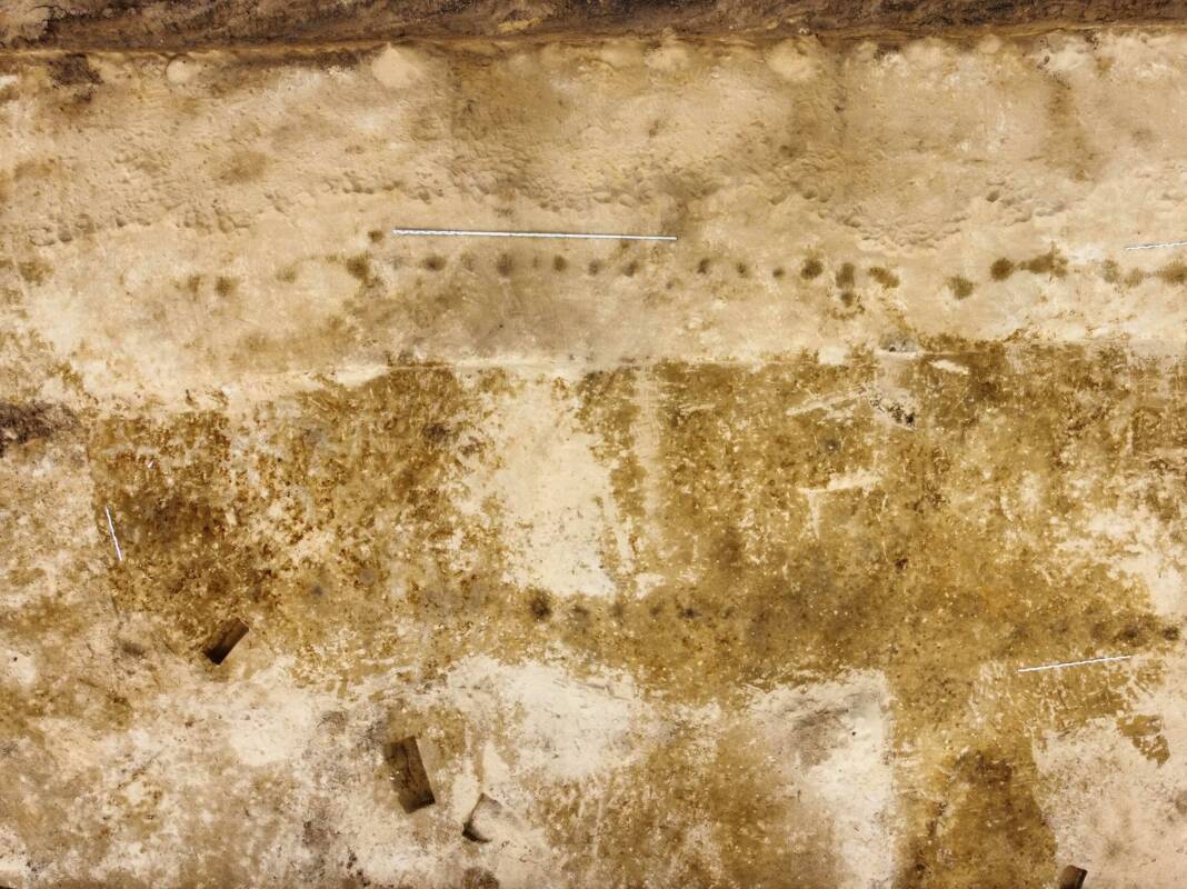Im nördlichen Bereich der Grabungsfläche entdeckte das Team zudem eine großflächige Bodenverfärbung, die zunächst Rätsel aufgab. Profilschnitte zeigten, dass es sich dabei um eine ungewöhnlich mächtige Kulturschicht handelt – also eine Bodenschicht, die größtenteils aus menschlichen Siedlungsabfällen wie Keramikscherben, Holzkohle und Tierknochen besteht.